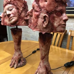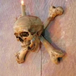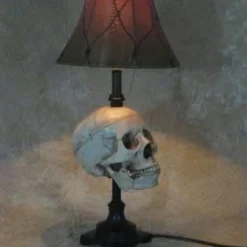 Unique Devil Skull Desk lamp with Skull Cross Bone Shade is a must for almost any one serious in the haunt business. Uses standard 40 watt bulb, not included. Can use either eerie yellow bulb, as shown, or standard white light. 23″ tall by about 10″ wide. Weight is 3 pounds.