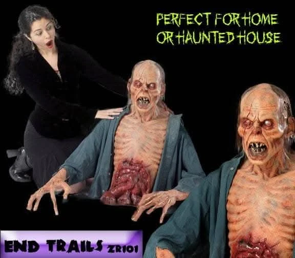An ancient prophesy has come true, and the dead are again walking the Earth. Looks like your beautiful new home was built on top of a cemetery, because the End Trails Zombie is rising out of your front yard. Gashed open and dripping blood and guts, this grotesque figure struggles to pull his body up from the ground. Do you run outside to kill him or pack your things and bolt out the backdoor? Who knows how many others are buried on these grounds and ready to rise. The End Trails Zombie Riser Halloween decoration is a Hollywood-quality prop that is perfect for a haunted graveyard scene in your local burial ground, or a makeshift gravesite on your lawn. Hand painted by the truly inspired artists and craftspeople at The Horror Dome, these petrifying props are dreadfully realistic. They’ll be the talk of the neighborhood this holiday season. Welcome frightened trick or treaters with this bone-chilling monster.