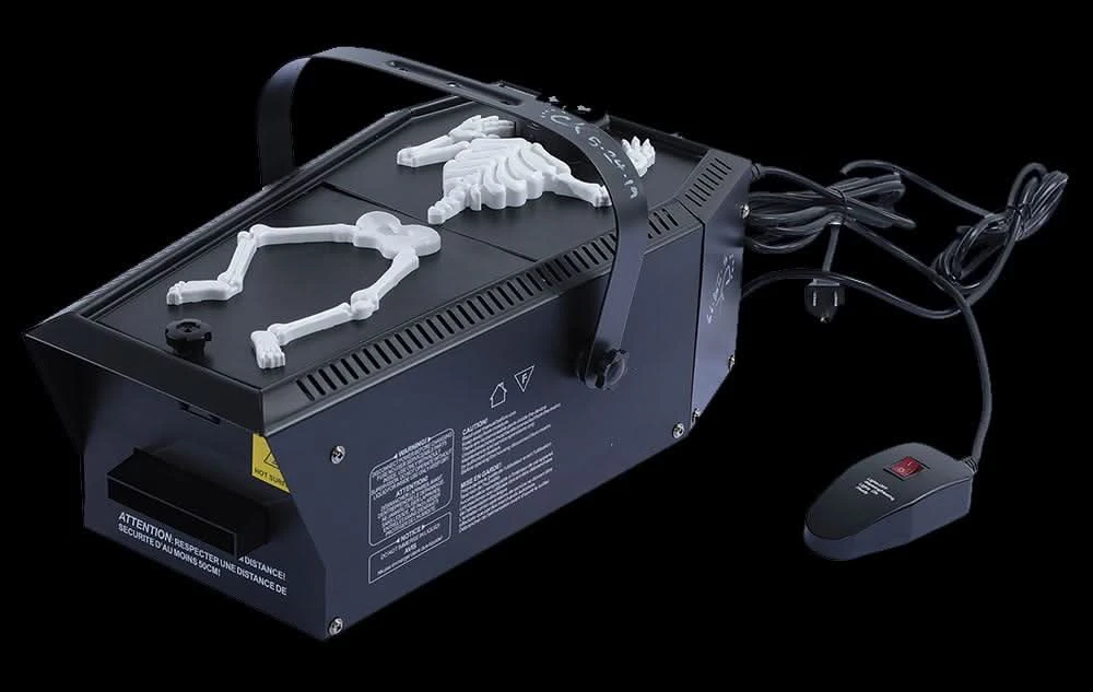 Our most powerful economy fog machine, the 1000 Watt Skeleton Fogger, is loved by professionals who need a large amount of fog. Includes a wired remote. Requires fog fluid not included. Power: AC 120V 60Hz, heater: 1000W, output: 3000 cu.Ft/Min, Fuse: 125V 10A, warming up: 3-5 minutes. Corffin-shaped unit with a decorative Skeleton Design on the top.