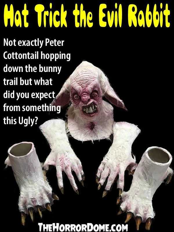 Not exactly Peter Cottontail hopping down the bunny trail; Hat Trick the Rabbit is a ruthless rodent who roams the forest at night in search of his prey. This horrific hopper isn’t interested in carrots though, he has an unsatisfiable lust for warm flesh. Don’t go down the rabbit hole with Hat Trick, you’ll surely never return. He’ll get his revenge for those delicious stews featuring tender braised bunny meat. Respect his territory, and hopefully you won’t cross paths. The Hat Trick the Rabbit Halloween costume is a Horror Dome original that offers Hollywood-style realism at a fraction of the price. Hand crafted by highly-skilled craftspeople, this monster bunny has bulging, bloodshot eyes, and ferocious teeth that are ready to tear into his next victim. With an over the head style mask, and arms and feet featuring menacing claws, all you need to add is some torn up clothing and you’re good to go.