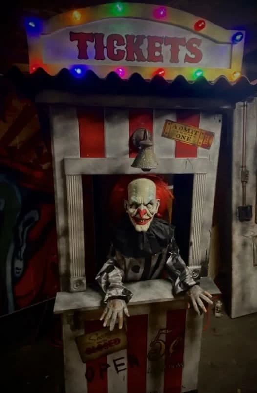 When triggered ticket booth window drops and clown lunges forward. His flailing arms and head move side to side. The clown laughs and lights licker in conjunction with the sound effects. Makes for the ultimate show stopper.