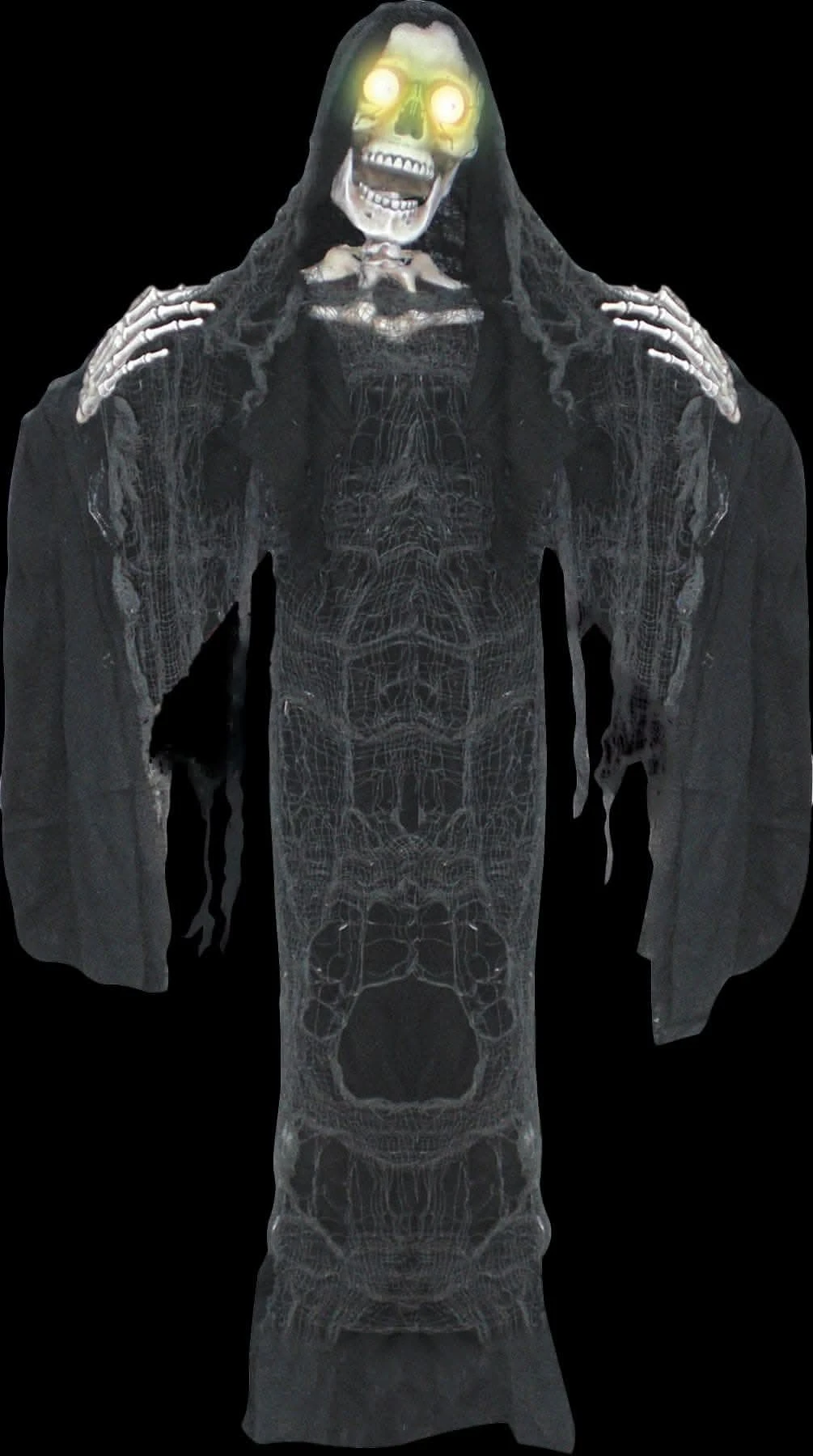 Skeleton with LED eyes and moving jaw with sound and TRY ME button. Requires 3 AAA batteries. Each in shipping carton with color label. Product Size: 72in x 27in x 4in.