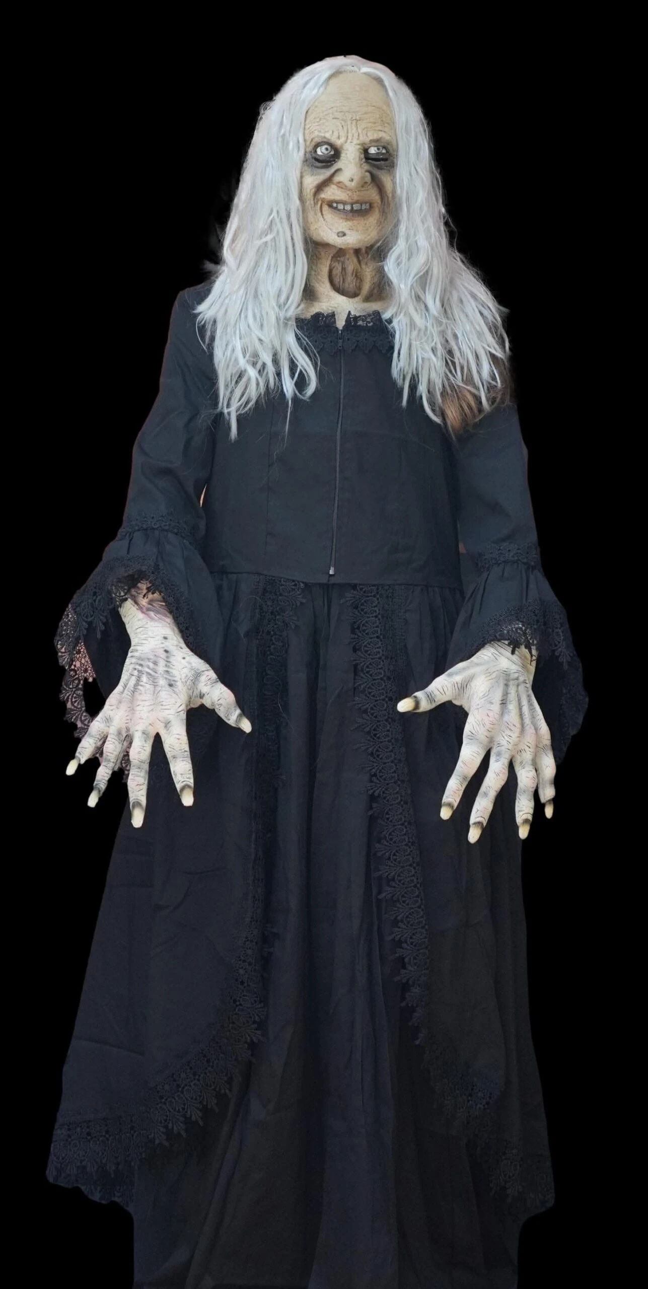 This wicked witch comes with everything you see. Witchy Woman mask, a professional dress that is movie-quality with high-quality fabric, and latex gloves.